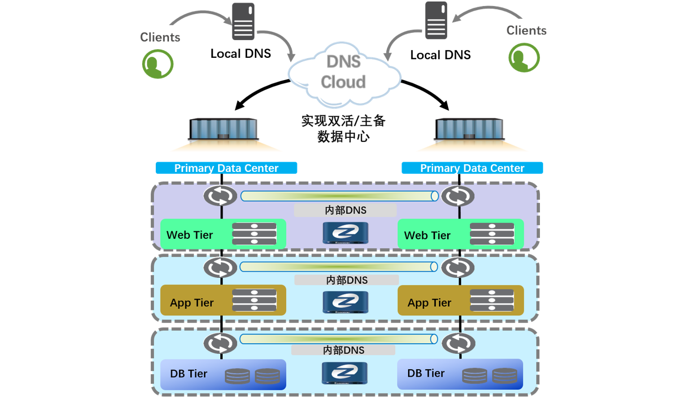 数据中心为提高应用系统的可靠性,实现多站点资源分布式部署,提高资源的利用率,需要多站点的应用系统构建成多活或主备工作模式。为了与IP地址解耦,通常会使用域名系统(DNS)来调度这些应用。米兰milantiyu多数据中心域名(DNS)解决方案以IT整体架构为蓝图,以业务连续性保障为目标,利用域名解析门户应用调度功能,可将用户访问流量引流到可靠、可用的数据中心进行访问,既能保证用户的使用体验,又能达到应用容灾的无感切换的目的。